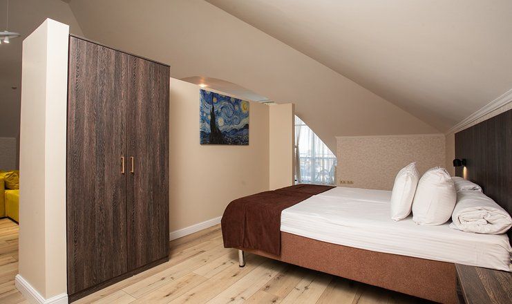 В номере: кровати двуспальные, кухонная мебель, набор мягкой мебели, прикроватные тумбочки, стол, столик журнальный, стулья, шкаф, гладильная доска, кондиционер, микроволновая печь, набор посуды, сейф, сплит-система, телевизор ЖК: 3, телефон, утюг, холодильник, чайная станция и бутилированная вода